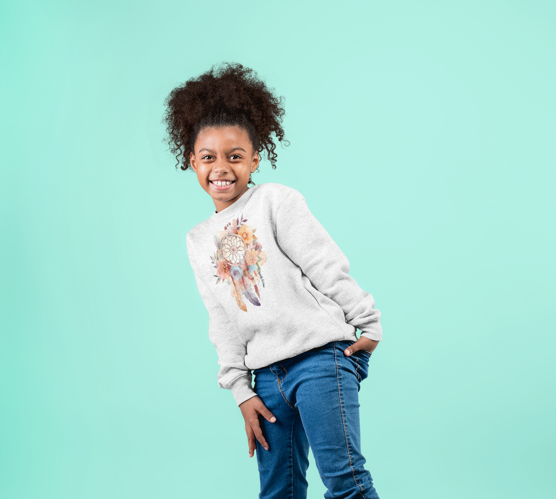 This kid's sweatshirt features a beautiful dream catcher. It's made with 50% cotton and 50% polyester creating a medium-heavy fabric that delivers a cozy, warm feeling on those chilly days. The ribbed knit collar helps the garment retain its shape, while the tubular knit construction reduces fabric waste. With a looser fit and tear-away label, our sweatshirts run true-to-size for a great fit. Give the kiddo in your life the gift of comfort and style with one of our boho style sweatshirts today.